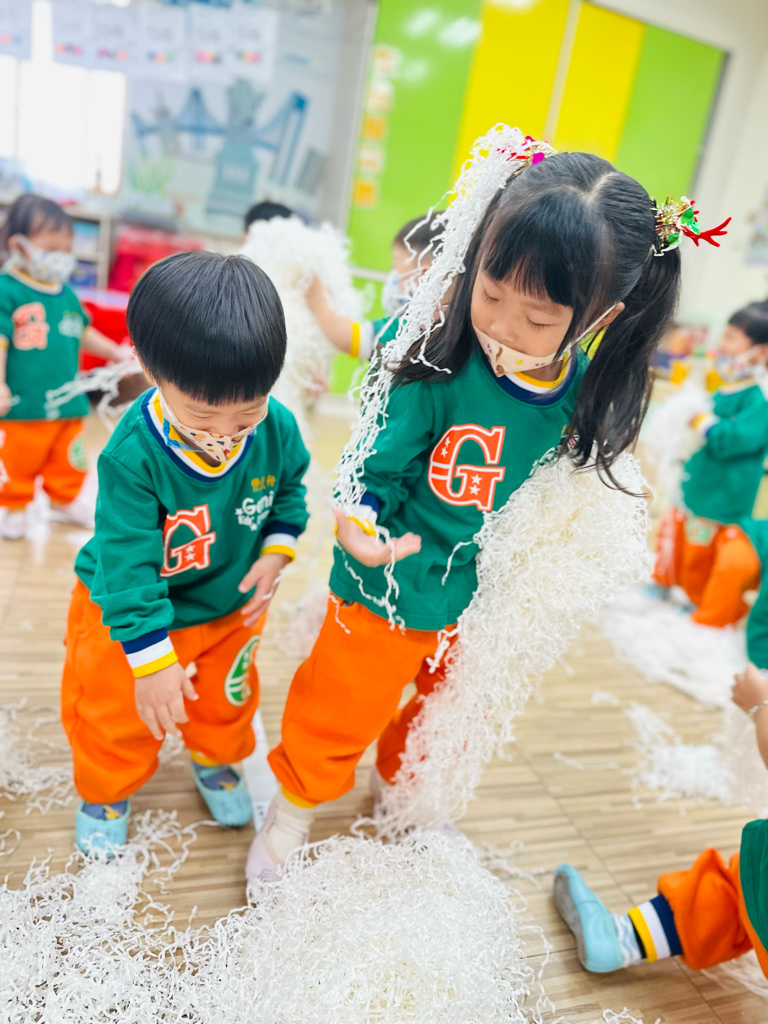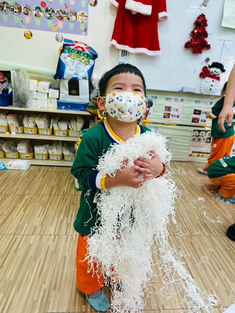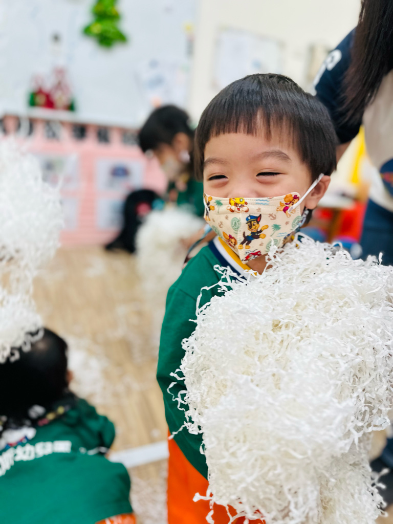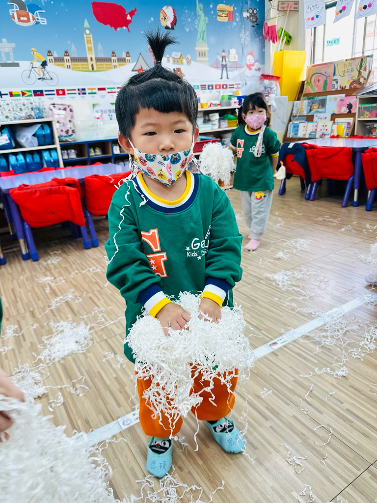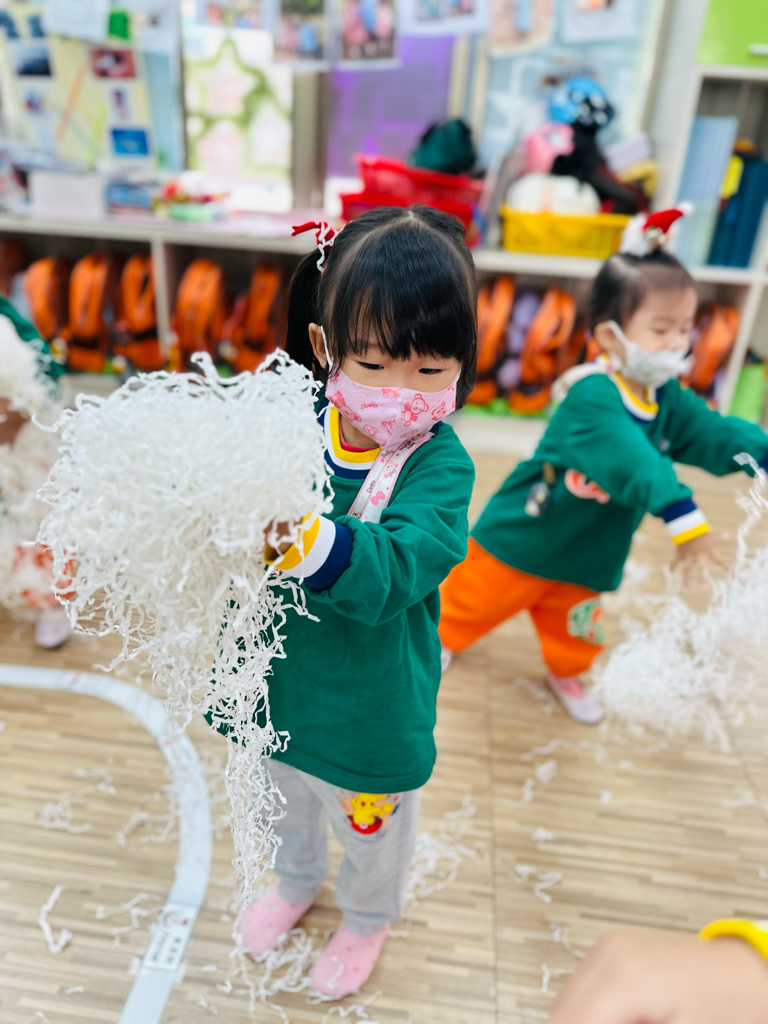 12.23 在教室裡營造白色的下雪世界~讓孩子們感受下雪氛圍❄️他們也玩得超開心唷!⛄️😆