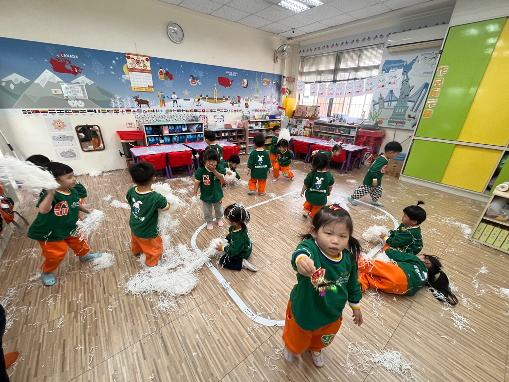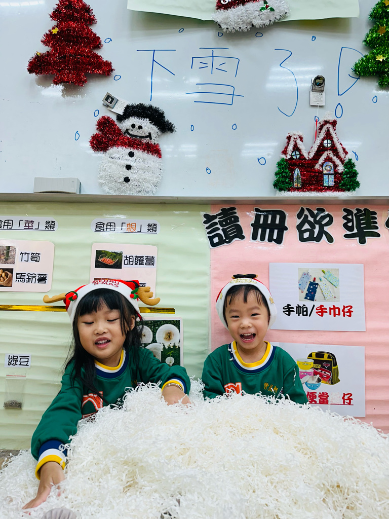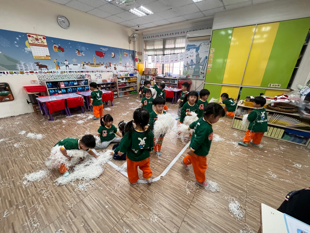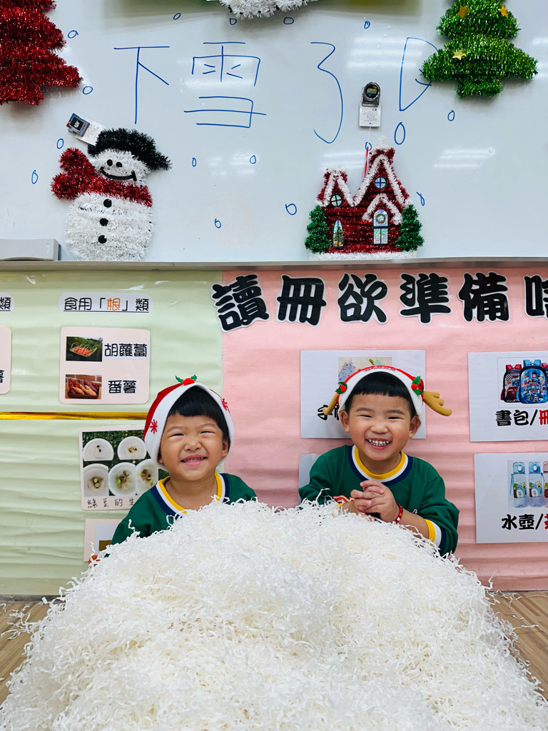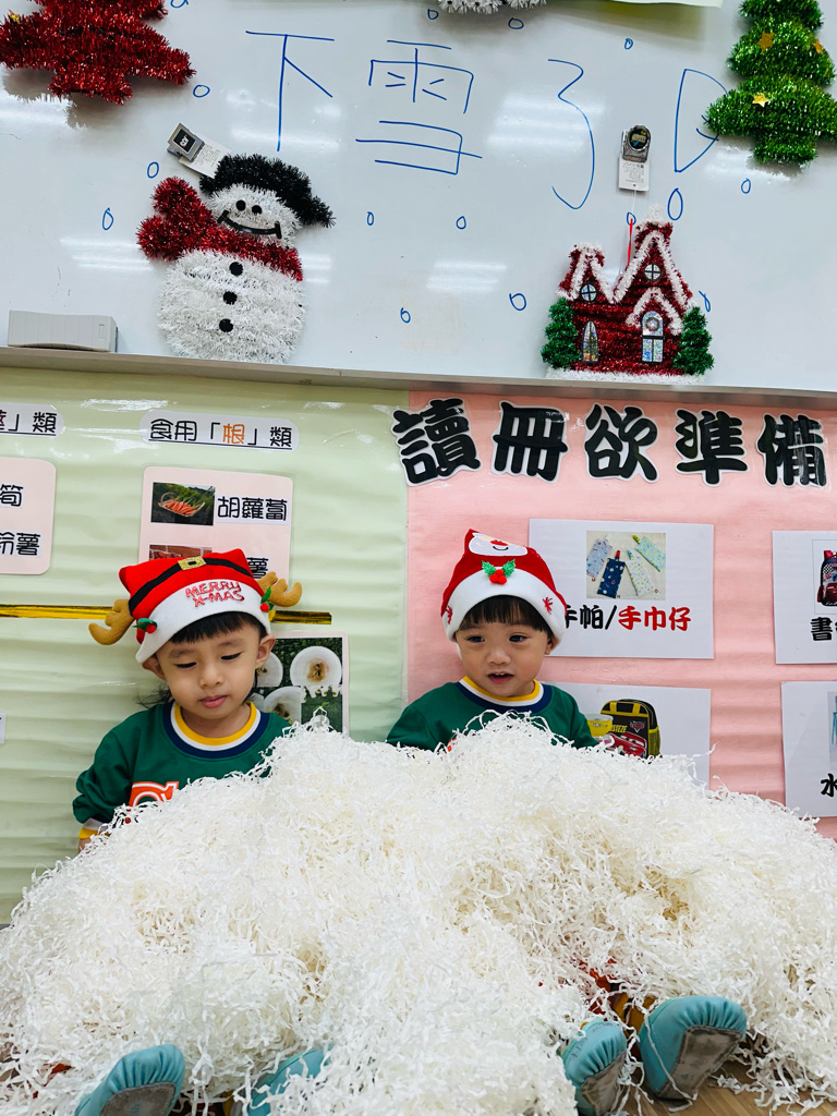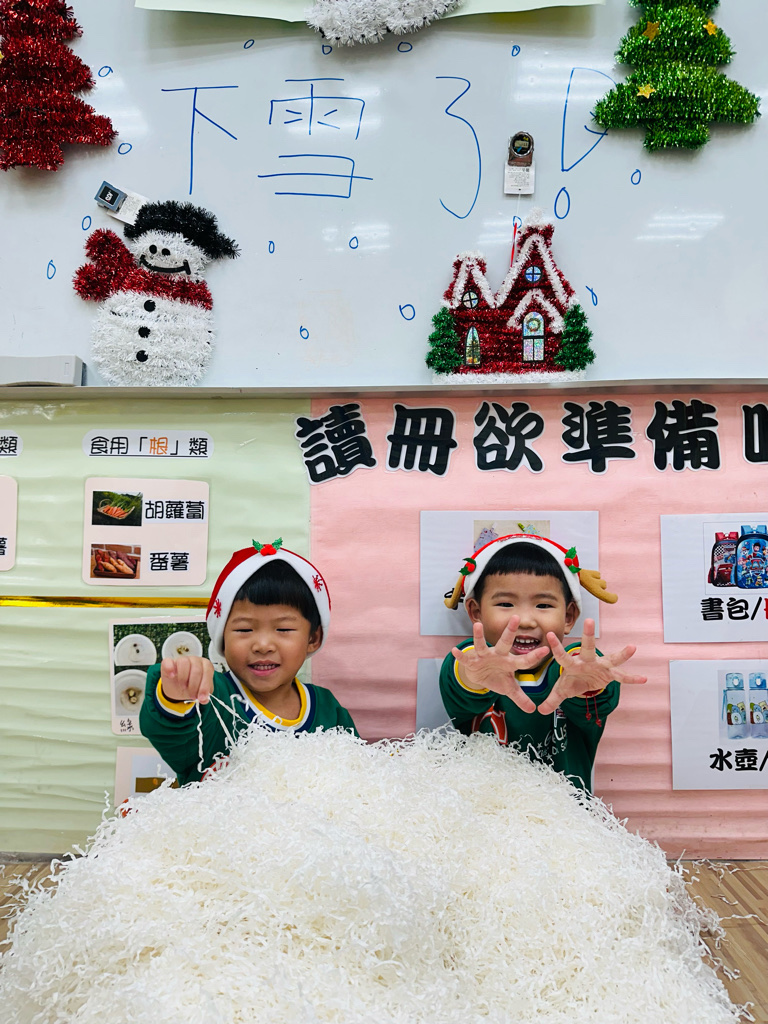 12.23 在教室裡營造白色的下雪世界~讓孩子們感受下雪氛圍❄️他們也玩得超開心唷!⛄️😆